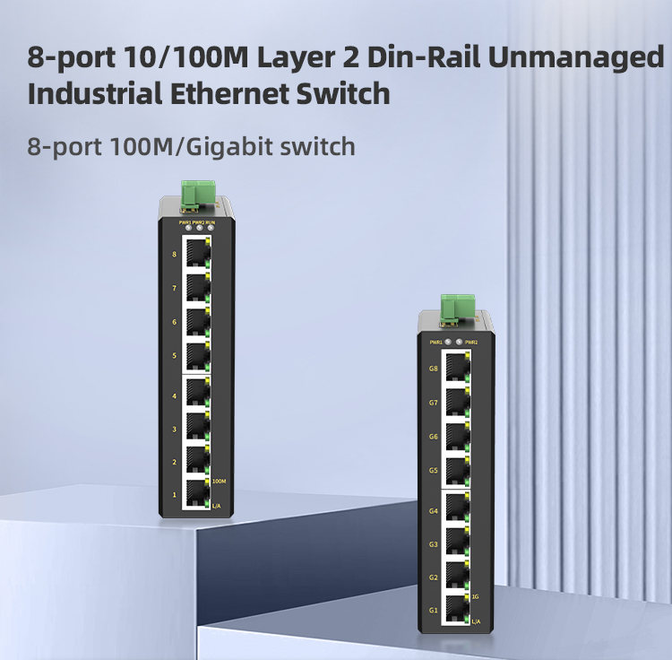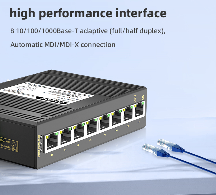 The industrial Ethernet switch adopts high-performance imported switching chip to ensure the stable transmission of large traffic data, and supports 10/100/100M adaptive electrical port; Support -40~85℃ operating temperature, industrial power protection, indicator status display, guide rail/rack installation, fan-less thermal housing design, to achieve real readout, convenient and fast, but also meet the EMC4 level protection, IP40 protection, 6000V lightning protection and other indicators, can adapt to a variety of harsh industrial environment application needs. ● 10/100B/1000Base-T Adaptive Port Support Full/Half Duplex, MDI/MDIX Auto Connection ● IP40 Rated Housing with Fanless Design ● Redundancy Dual Power Supply ● Built in 1-Relay Alarm for Power Failure ● Satisfy Harsh Industrial Environment