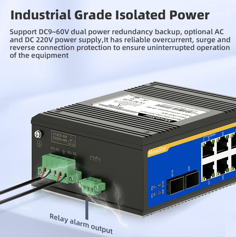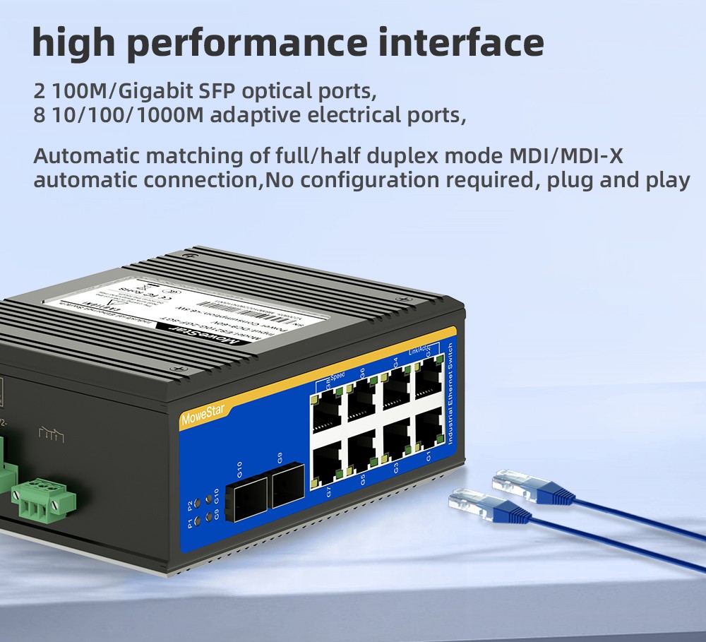 The industrial Ethernet switch adopts high-performance imported switching chip to ensure the stable transmission of large traffic data, and supports 10/100/100M adaptive electrical port; Support -40~85℃ operating temperature, industrial power protection, indicator status display, guide rail/rack installation, fan-less thermal housing design, to achieve real readout, convenient and fast, but also meet the EMC4 level protection, IP40 protection, 6000V lightning protection and other indicators, can adapt to a variety of harsh industrial environment application needs.