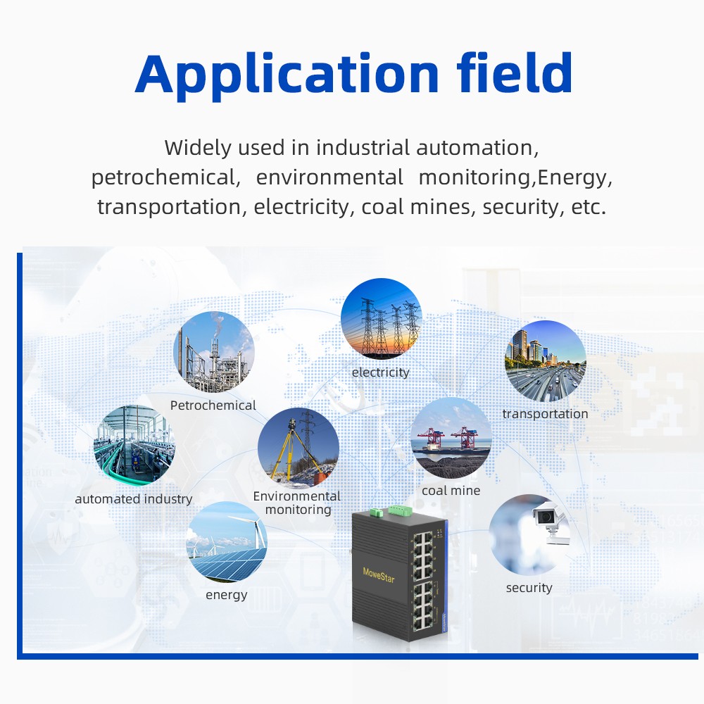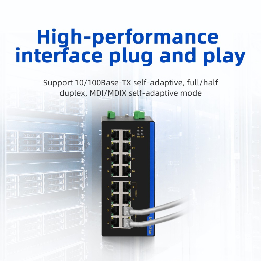 The industrial Ethernet switch adopts high-performance imported switching chip to ensure the stable transmission of large traffic data, and supports 10/100/100M adaptive electrical port; Support -40~85℃ operating temperature, industrial power protection, indicator status display, guide rail/rack installation, fan-less thermal housing design, to achieve real readout, convenient and fast, but also meet the EMC4 level protection, IP40 protection, 6000V lightning protection and other indicators, can adapt to a variety of harsh industrial environment application needs. ● 10/100BaseT(X) (RJ45 Connector) ● IP40 Aluminum Alloy Shell with Fanless Design ● Support Power-down Status Reply Alarm Output ● Working Temperature -40 to 85°C ● Satisfy Harsh Industrial Environment
