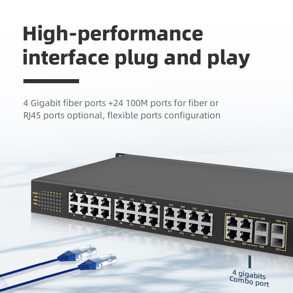 The industrial Ethernet switch adopts high-performance imported switching chip to ensure the stable transmission of large traffic data, and supports 10/100/100M adaptive electrical port; Support -40~85℃ operating temperature, industrial power protection, indicator status display, guide rail/rack installation, fan-less thermal housing design, to achieve real readout, convenient and fast, but also meet the EMC4 level protection, IP40 protection, 6000V lightning protection and other indicators, can adapt to a variety of harsh industrial environment application needs. ● Support 4 Gigabit Combo ports and 16x1000 Base-X ports ● support power status relay alarm output ● Support dual power supply ● Wide temperature range design, fanless thermal design