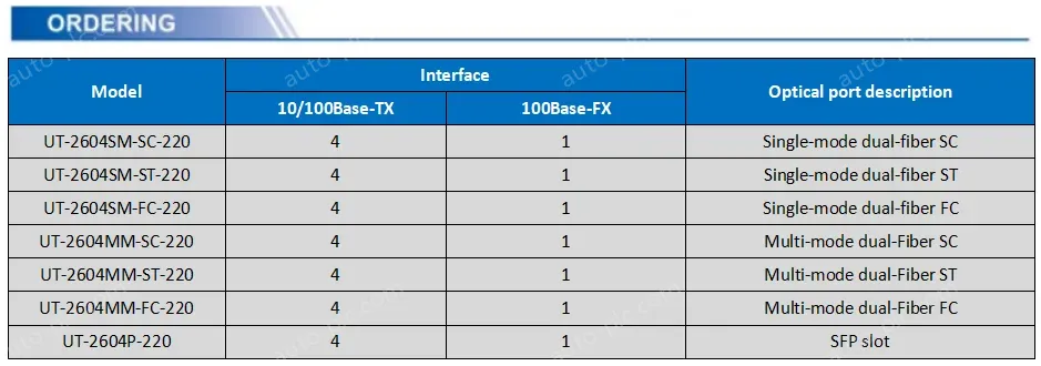 For example: UT-2604GRSM-SC-40-220, “R”is receiving single fiber, “SM” is single mode, “SC” fiber interface type is SC head, “40” transmission km for 40km