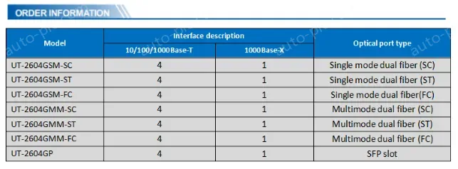 For example: UT-2604GRSM-SC-40, “R”is receiving single fiber, “SM” is single mode, “SC” fiber interface type is SC head, “40” transmission km for 40km