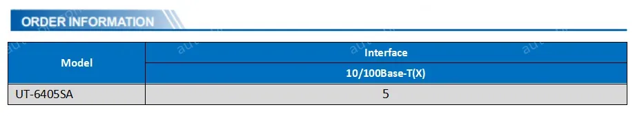 RJ45 interface: 5* 10/100/Base-TX, auto-detection, full/half duplex, auto MDI/MDI-X