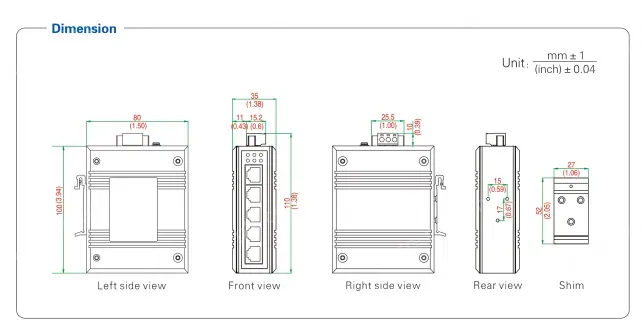 RJ45 ports: 5 10/100Base-T (X) ports, auto-detection, full/half duplex, auto MDI/MDI-X