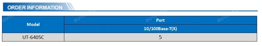 UT-6405C is a 5-port 100-M unmanaged Ethernet switch that provides positive and negative AC/DC input protection to prevent burnout of the instrument. It has a compact design and supports industry standard DIN-rail mounting, so it is easy to install in any industrial network application.