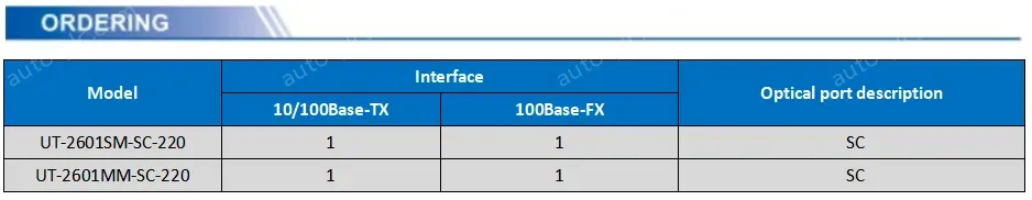 For example: UT-2601RSM-SC-40-220, “R”is receiving single fiber, “SM” is single mode, “SC” fiber interface type is SC head, “40” transmission km for 40km